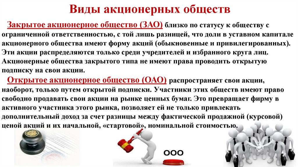 Виды акционерных обществЗакрытое акционерное общество (ЗАО) близко по статусу к обществу с