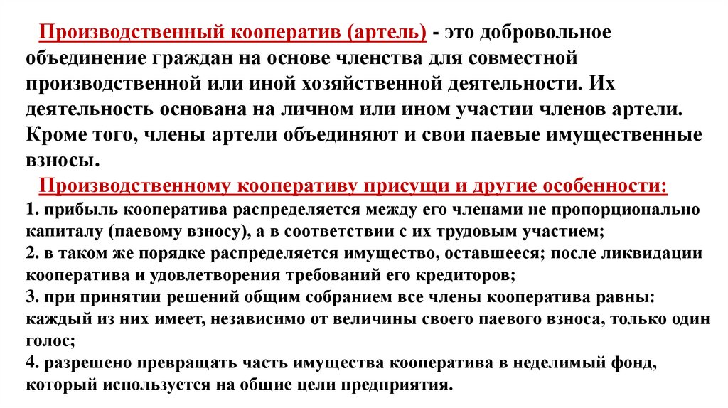 Производственный кооператив (артель) - это добровольноеобъединение граждан на основе членства для совместной
