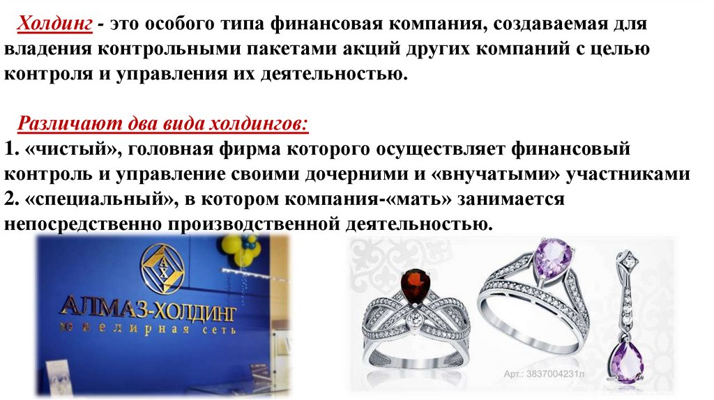 Холдинг - это особого типа финансовая компания, создаваемая длявладения контрольными пакетами акций других компаний с целью