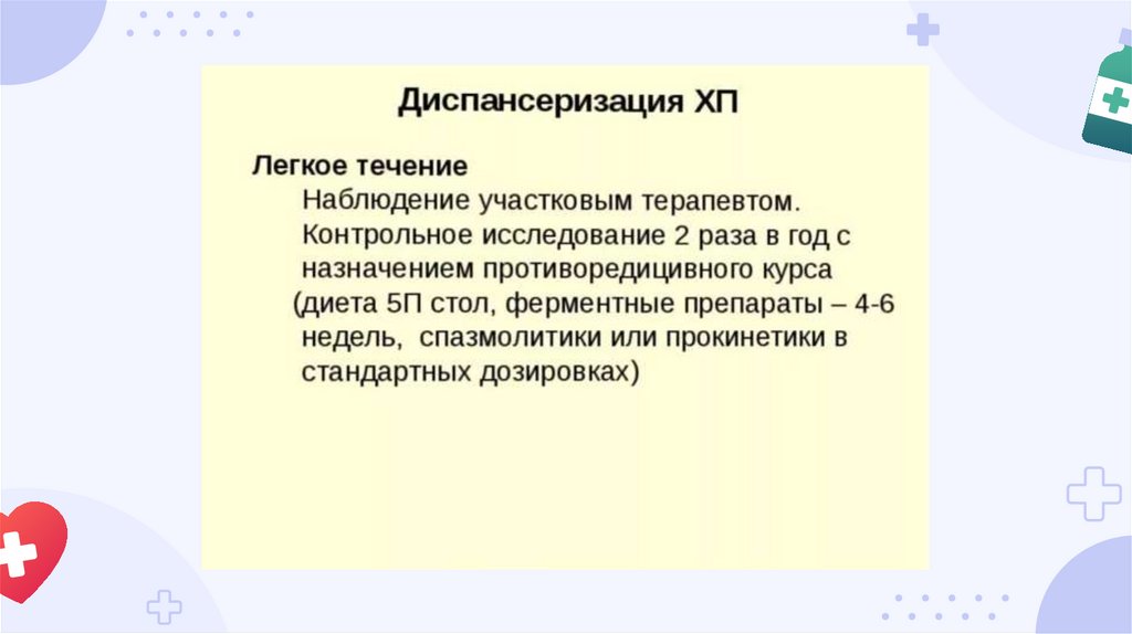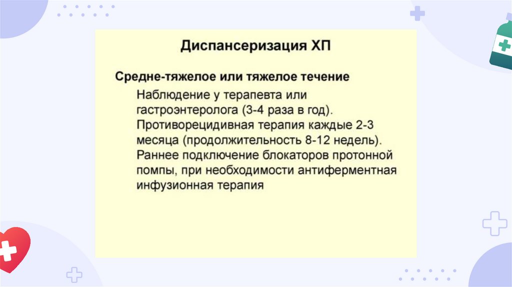 Консервативное лечение пациентов с ХП направлено на купированиесимптомов и предотвращение развитий осложнений. При этом выделяют 6