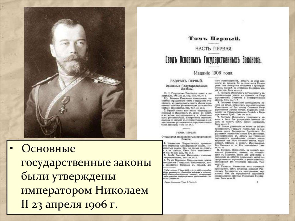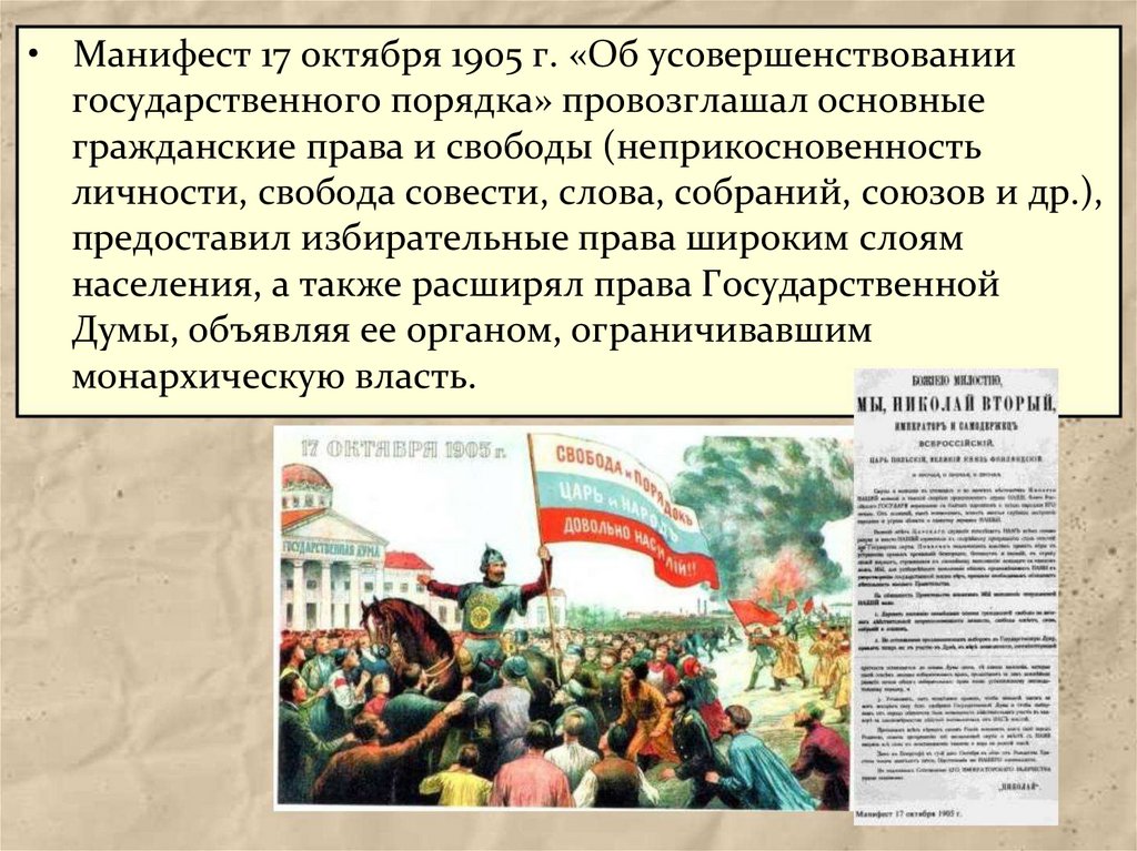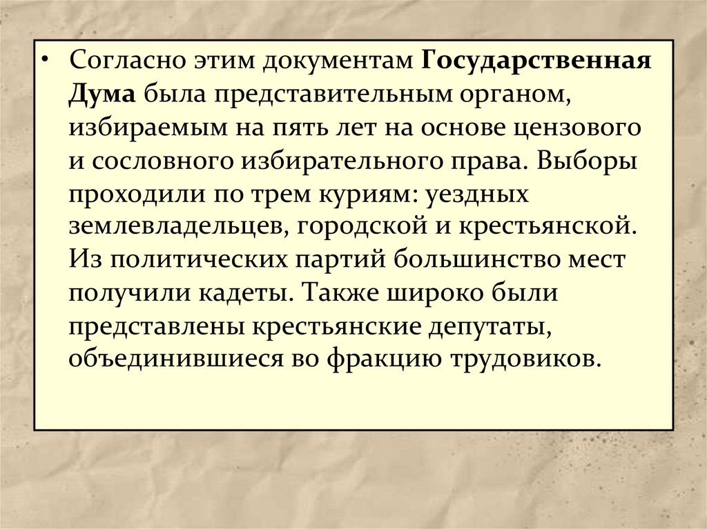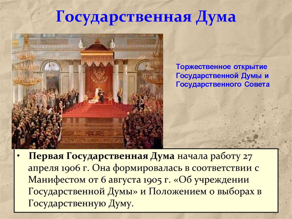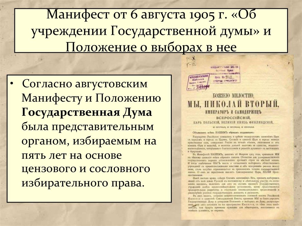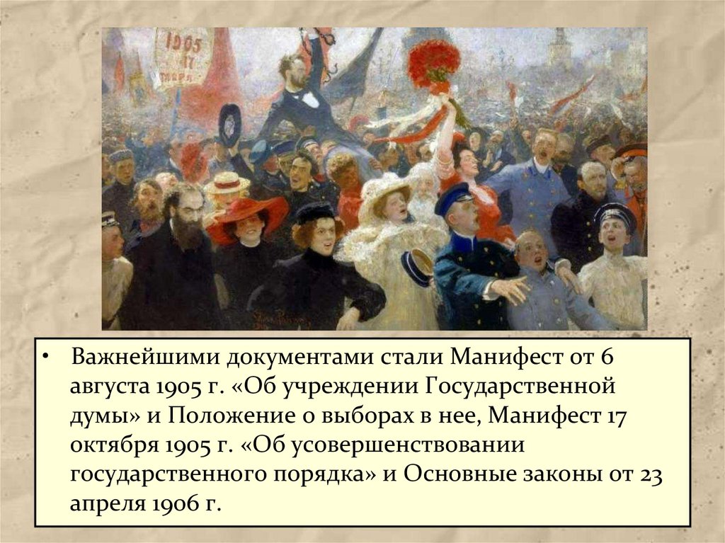 • Важнейшими документами стали Манифест от 6августа 1905 г. «Об учреждении Государственной