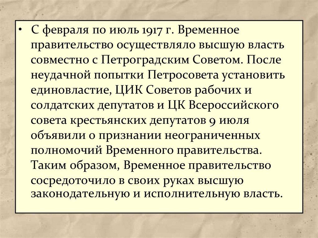 • С февраля по июль 1917 г. Временноеправительство осуществляло высшую власть