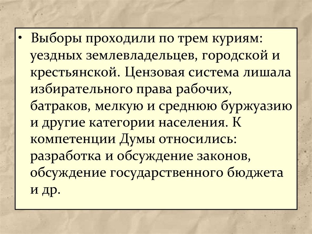 • Выборы проходили по трем куриям:уездных землевладельцев, городской и