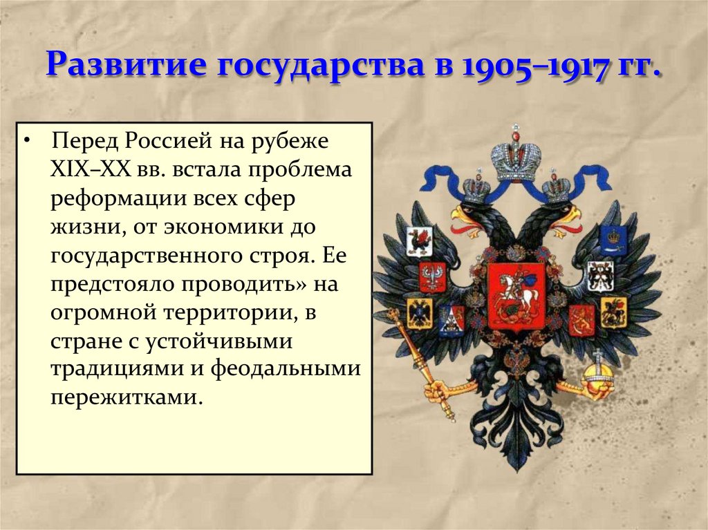 Развитие государства в 1905–1917 гг.• Перед Россией на рубеже