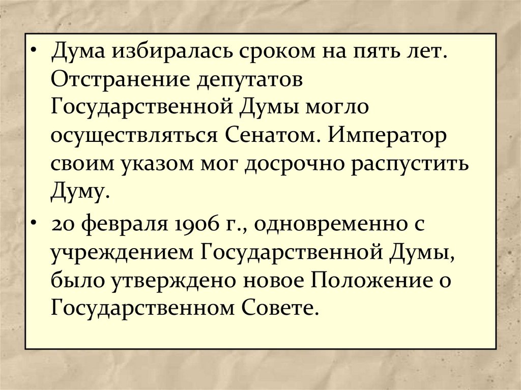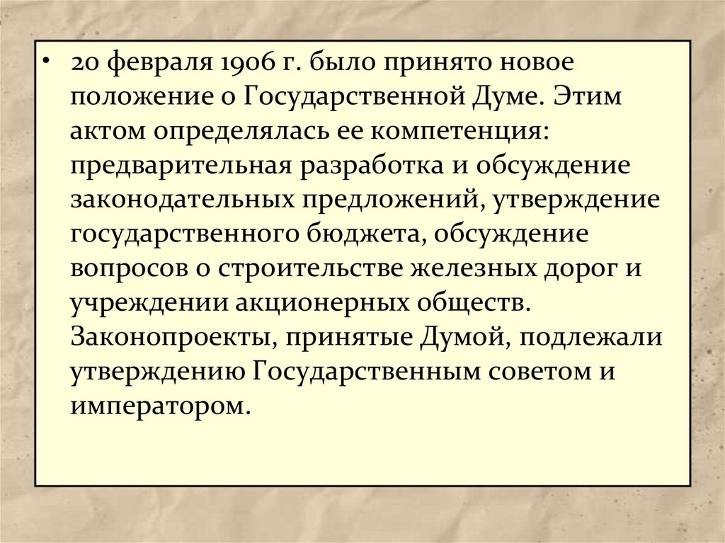 • Революционные события 1905 г. сорвали созывГосударственной думы.