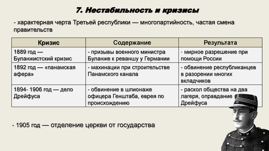 7. Нестабильность и кризисы- характерная черта Третьей республики — многопартийность, частая смена