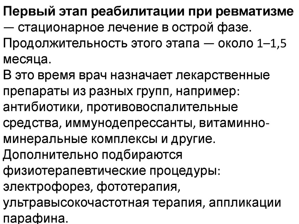 Первый этап реабилитации при ревматизме— стационарное лечение в острой фазе.