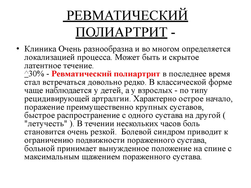 РЕВМАТИЧЕСКИЙПОЛИАРТРИТ • Клиника Очень разнообразна и во многом определяется
