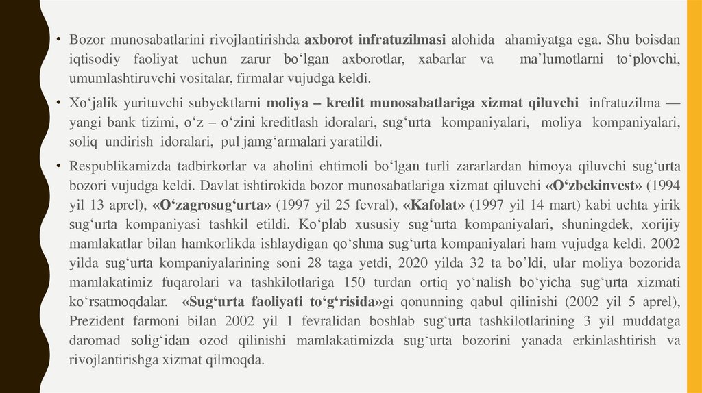 xо‘jaligi tо‘g‘risida qonunlar qabul qilindi. Bozor infratuzilmasini yaratuvchi va