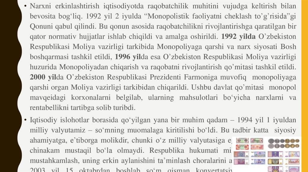 • 1. Oʼzbekiston Respublikasida bozor munosabatlarining shakllanishi, uninghuquqiy asoslarining yaratilishi.