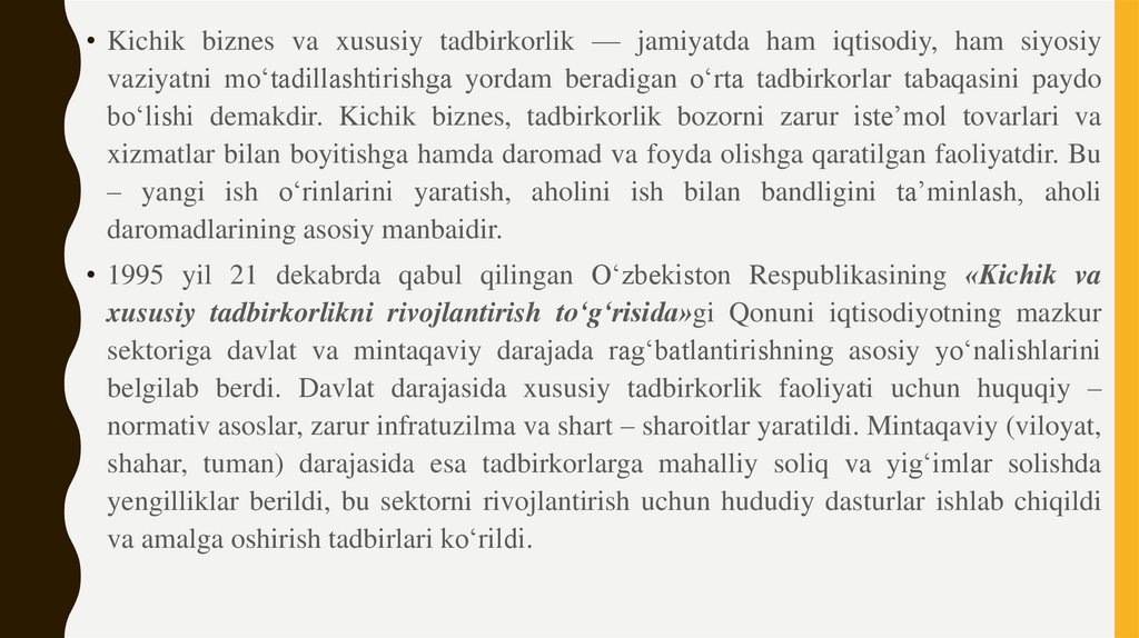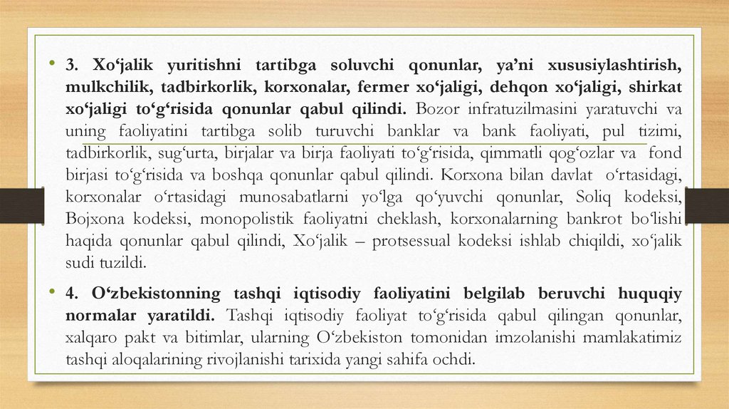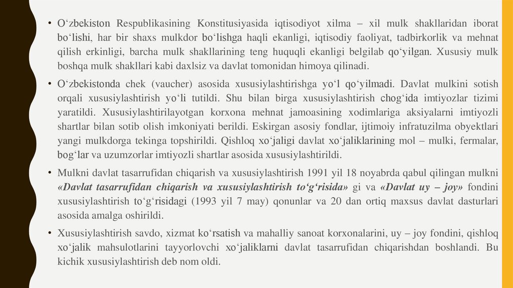 • 3. Xо‘jalik yuritishni tartibga soluvchi qonunlar, ya’ni xususiylashtirish,mulkchilik, tadbirkorlik, korxonalar, fermer xо‘jaligi, dehqon xо‘jaligi, shirkat