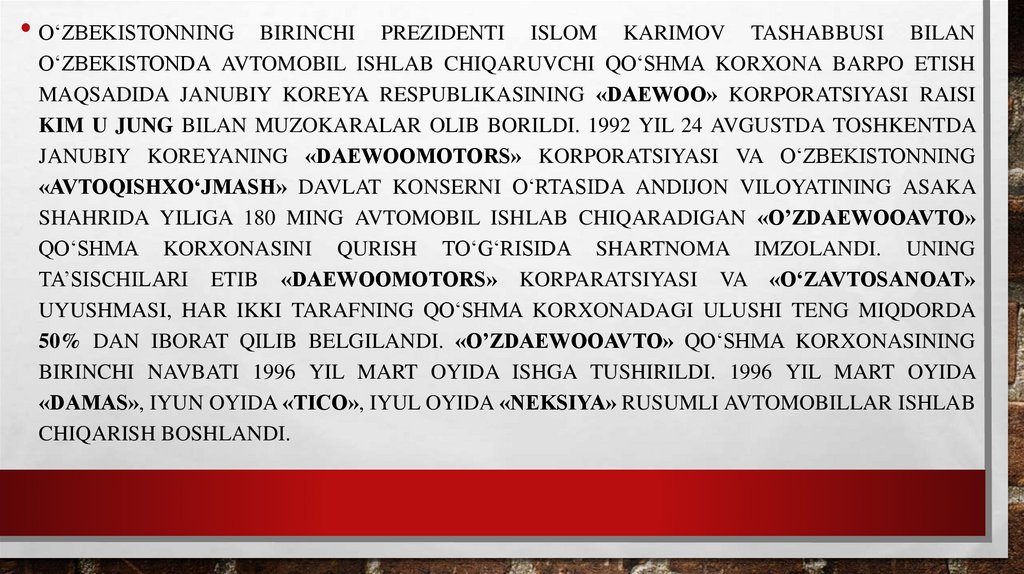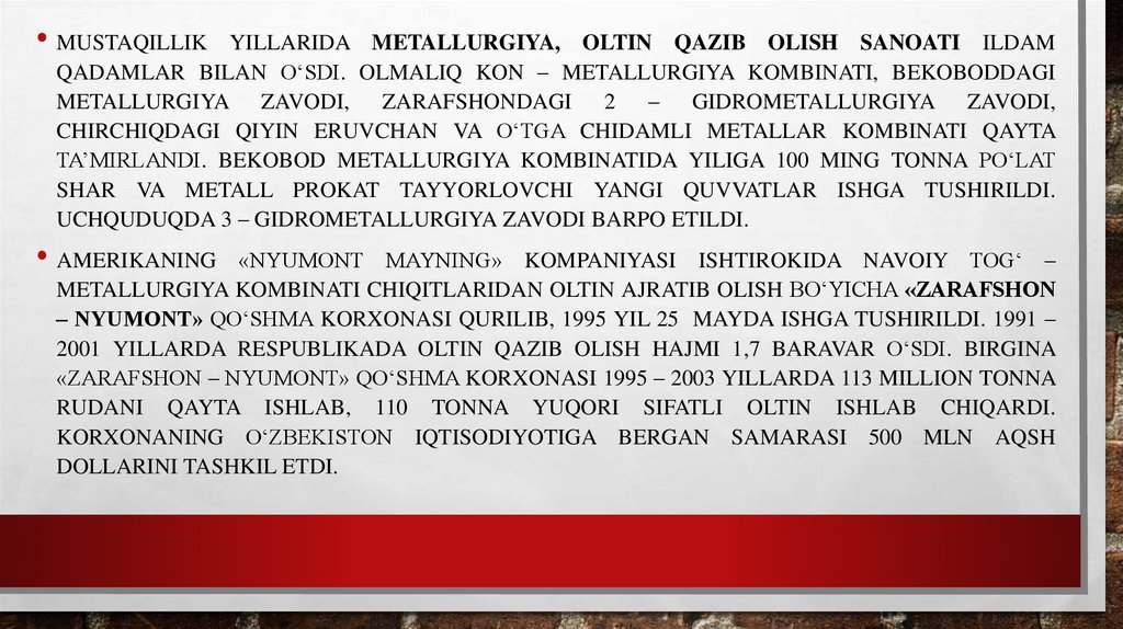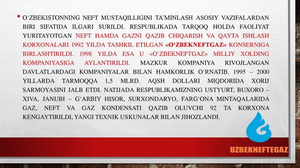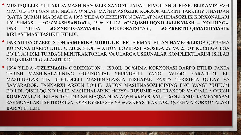 barpo qilindi. Mamlakatimiz iqtisodiy tanazzul davridan о‘tib oldi. 1995 yilga kelib