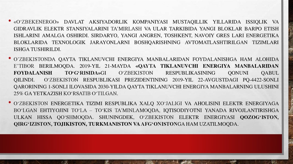 birjasi tо‘g‘risida va boshqa qonunlar qabul qilindi. Korxona bilan davlat о‘rtasidagi,