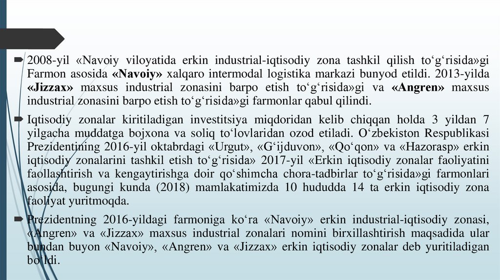 bundan buyon «Navoiy», «Angren» va «Jizzax» erkin iqtisodiy zonalar deb yuritiladigan