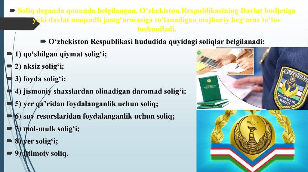 O‘zbekiston Respublikasi hududida quyidagi soliqlar belgilanadi: