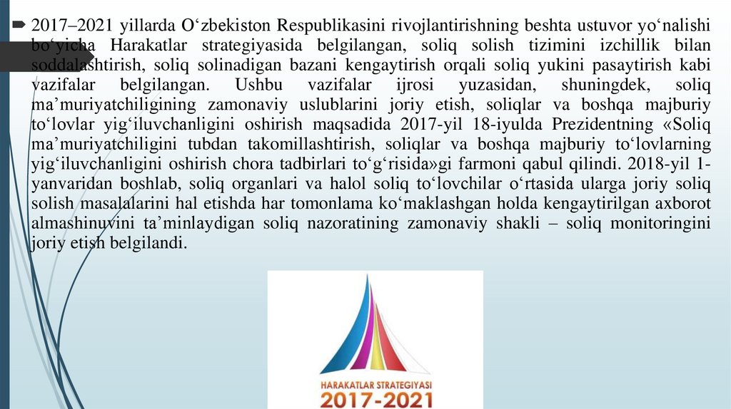 2017–2021 yillarda O‘zbekiston Respublikasini rivojlantirishning beshta ustuvor yo‘nalishibo‘yicha Harakatlar strategiyasida belgilangan, soliq solish tizimini izchillik bilan