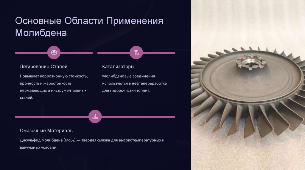 Молибден используется как легирующая добавка для создания высокопрочных сталей и суперсплавов.