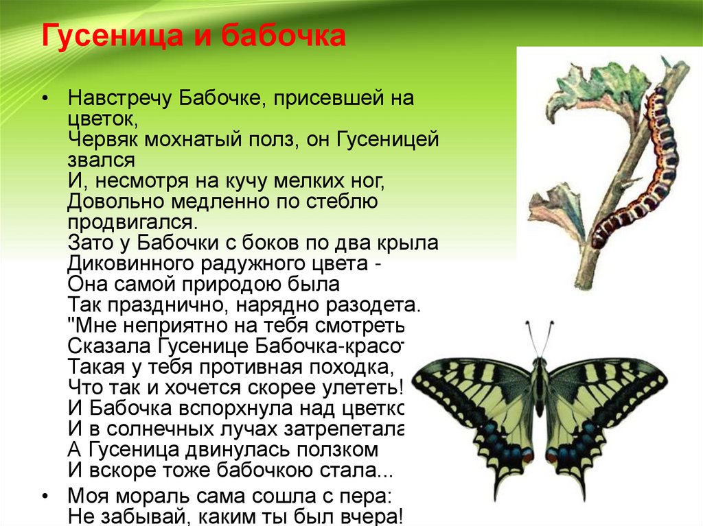 "Мне неприятно на тебя смотреть! Сказала Гусенице Бабочка-красотка, Такая у тебя противная походка,