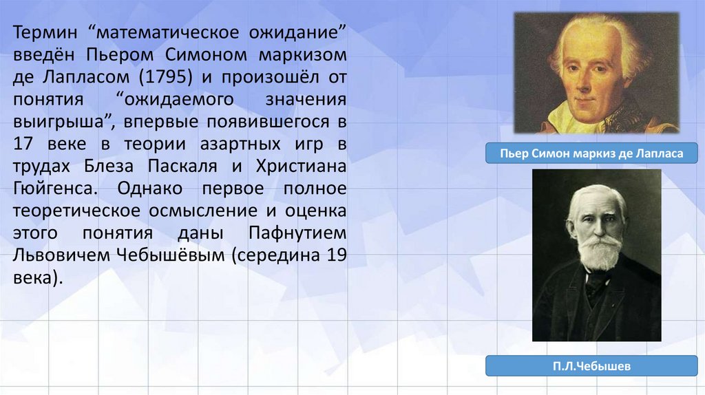 Термин “математическое ожидание”введён Пьером Симоном маркизом
