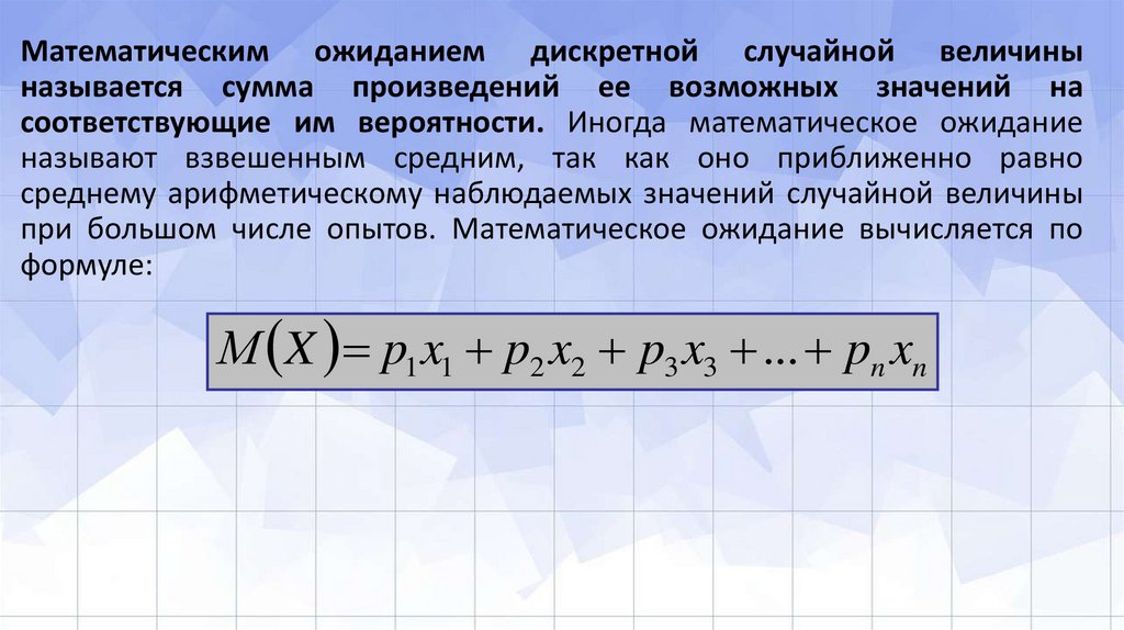Математическим ожиданием дискретной случайной величиныназывается сумма произведений ее возможных значений на