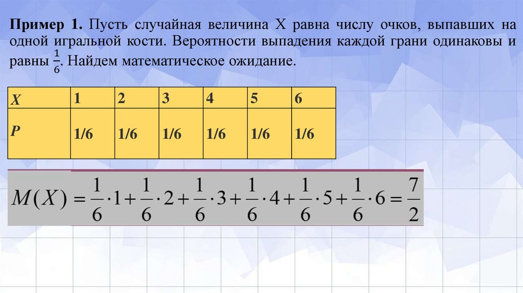 Пример 1. Пусть случайная величина Х равна числу очков, выпавших наодной игральной кости. Вероятности выпадения каждой грани одинаковы и