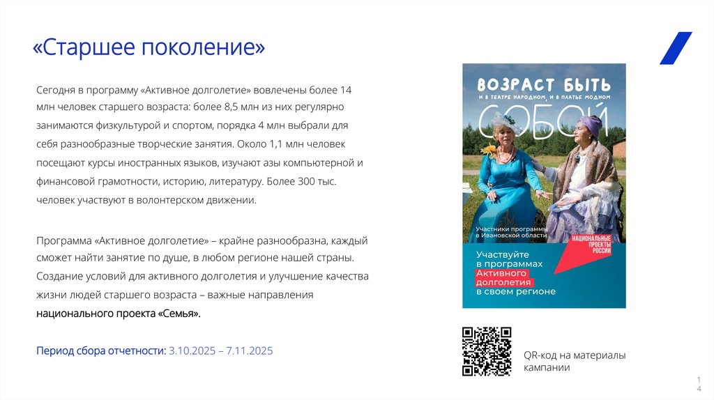Сегодня в программу «Активное долголетие» вовлечены более 14млн человек старшего возраста: более 8,5 млн из них регулярно