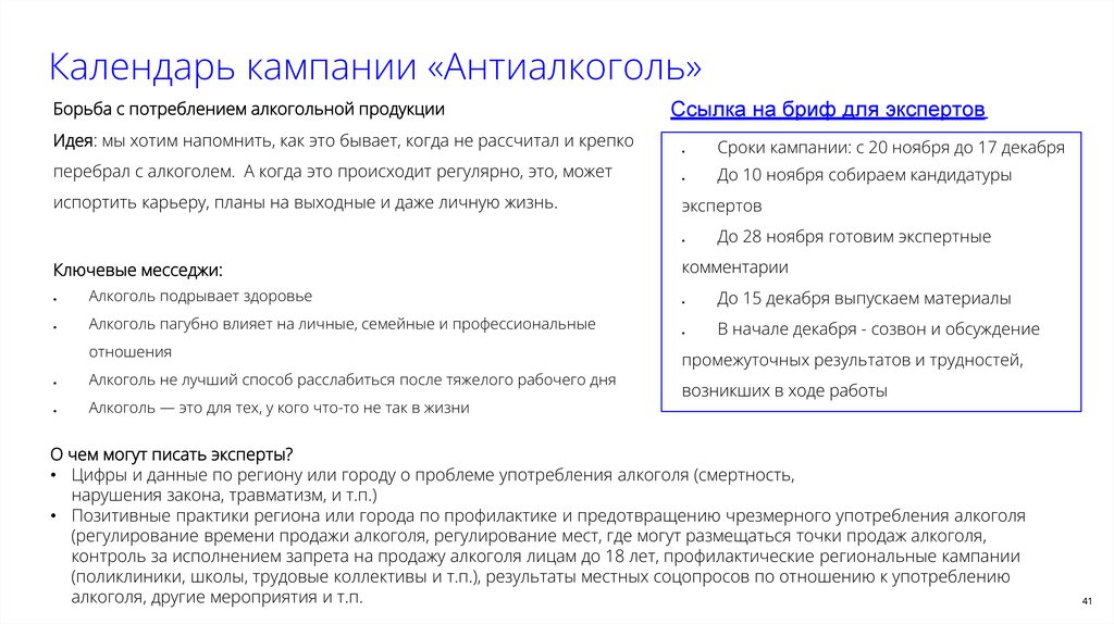 Календарь кампании «Антиалкоголь»Ссылка на бриф для экспертов