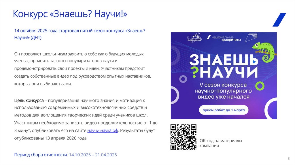 Он позволяет школьникам заявить о себе как о будущих молодыхученых, проявить таланты популяризаторов науки и