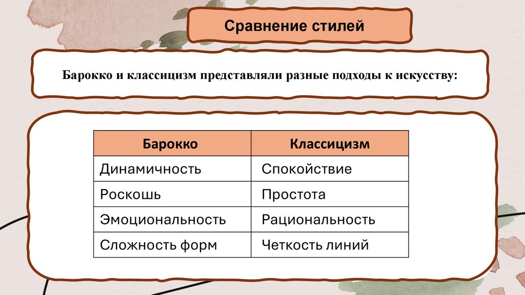 Сравнение стилейБарокко и классицизм представляли разные подходы к искусству: