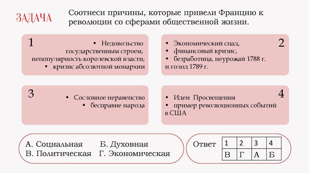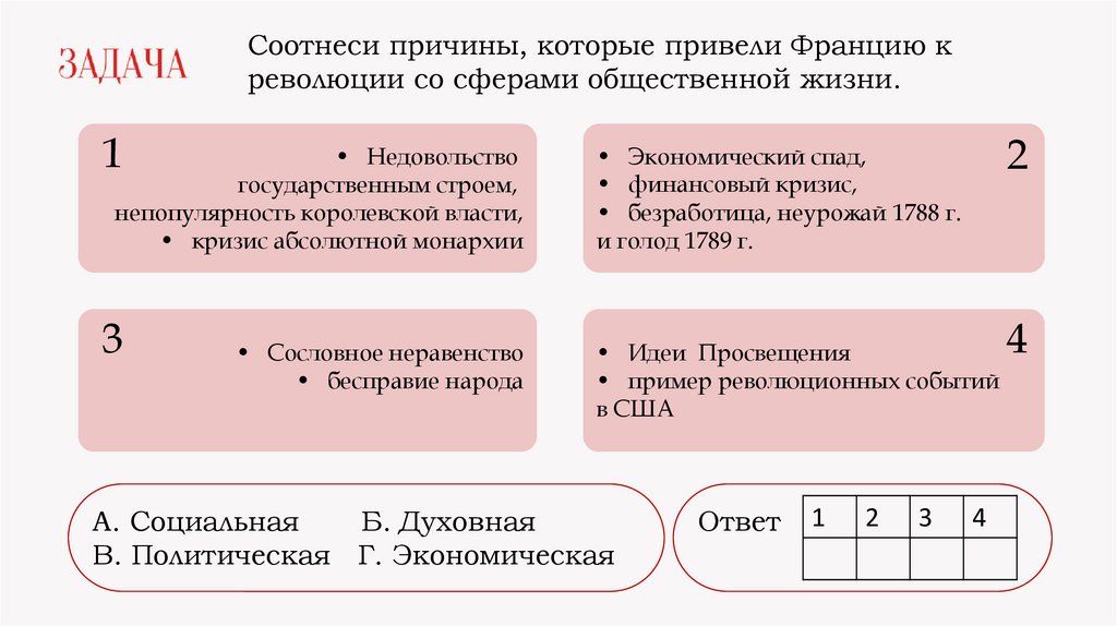 Соотнеси причины, которые привели Францию креволюции со сферами общественной жизни.