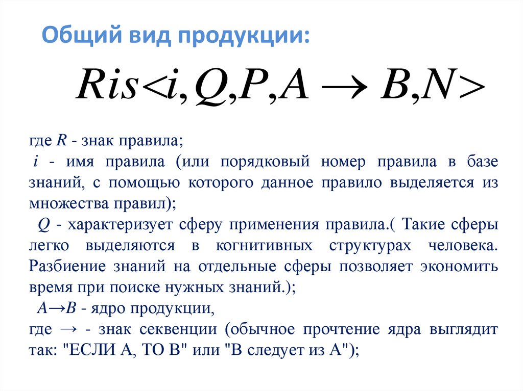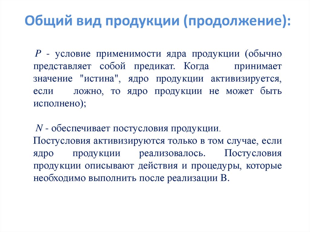 Общий вид продукции (продолжение):P - условие применимости ядра продукции (обычно