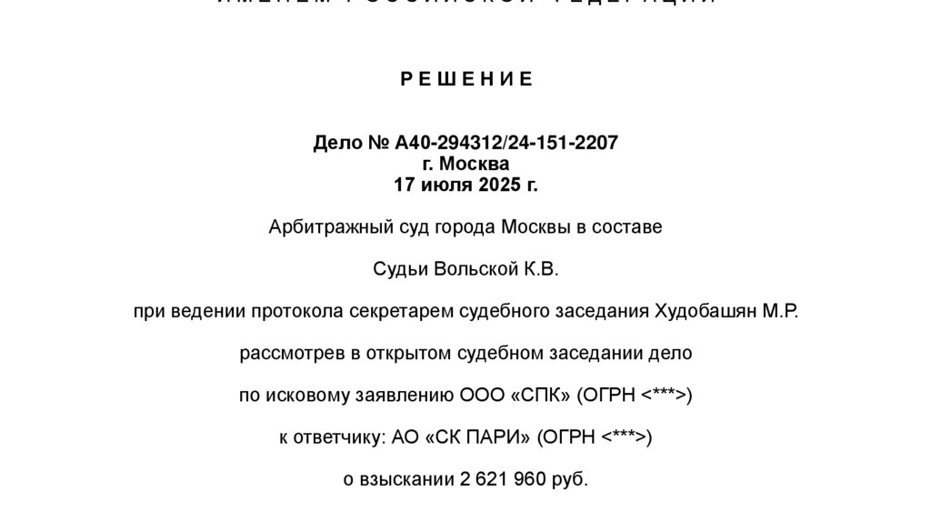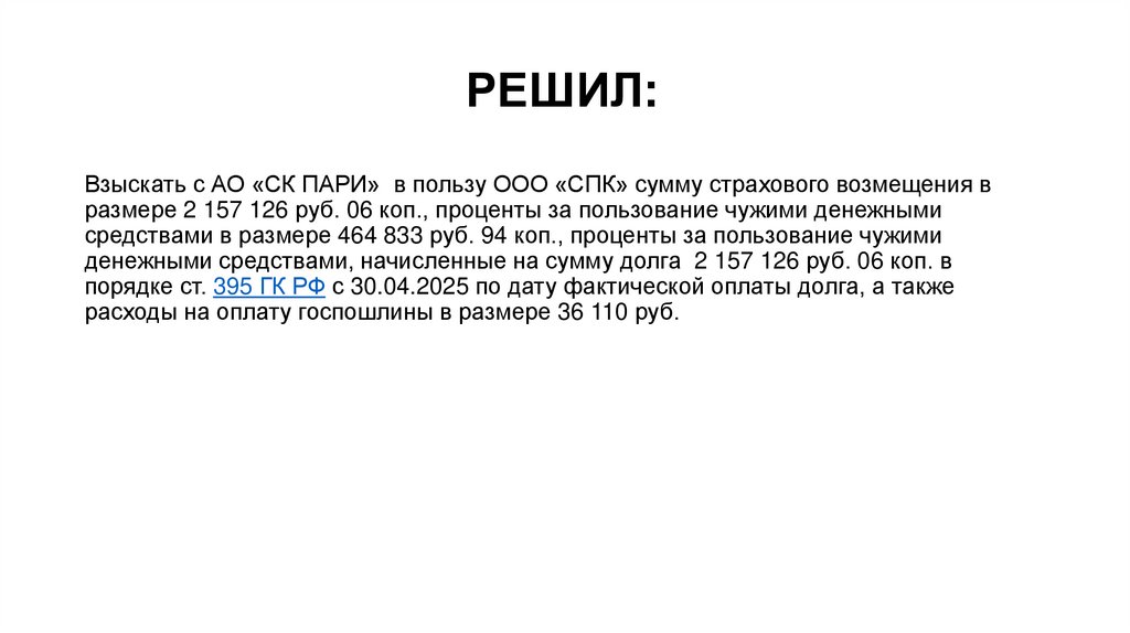 РЕШИЛ:Взыскать с АО «СК ПАРИ» в пользу ООО «СПК» сумму страхового возмещения в