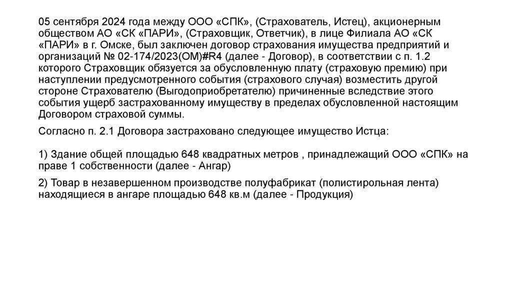 05 сентября 2024 года между ООО «СПК», (Страхователь, Истец), акционернымобществом АО «СК «ПАРИ», (Страховщик, Ответчик), в лице Филиала АО «СК