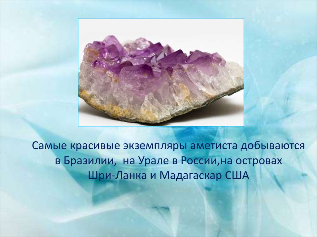 Самые красивые экземпляры аметиста добываютсяв Бразилии, на Урале в России,на островах