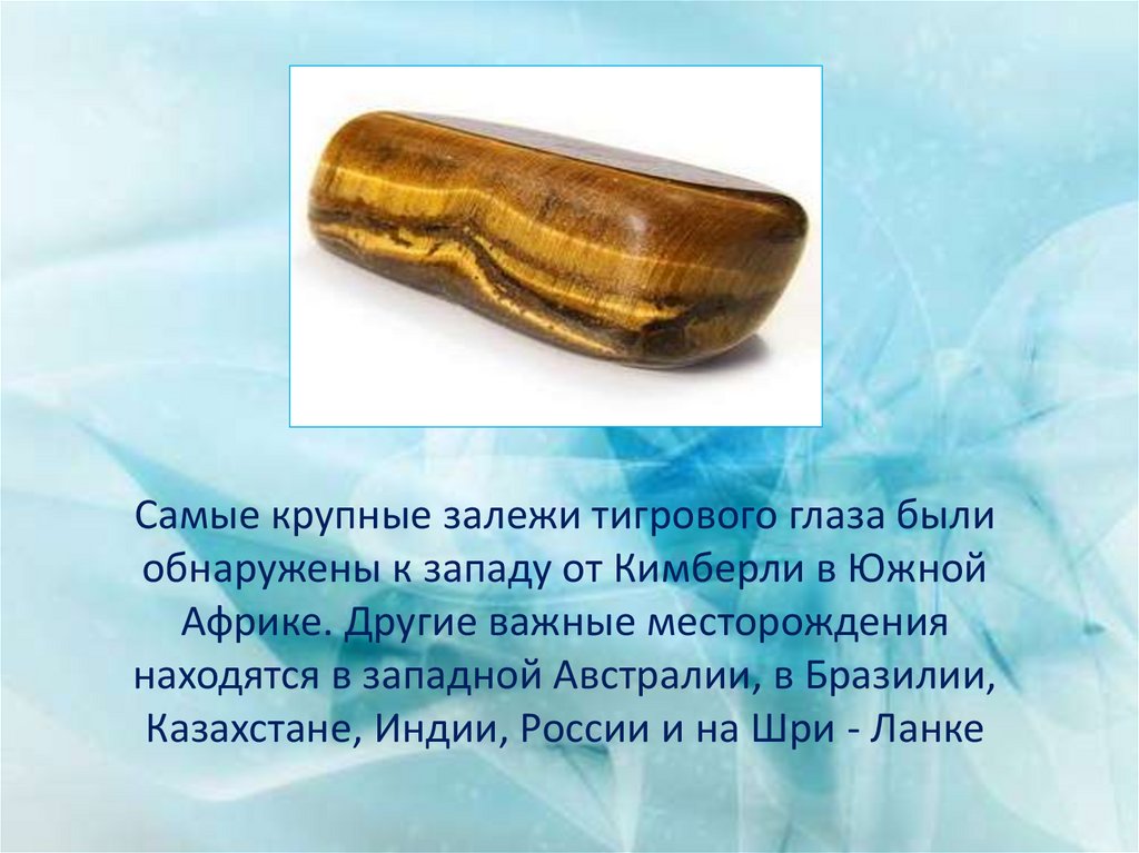 Самые крупные залежи тигрового глаза былиобнаружены к западу от Кимберли в Южной