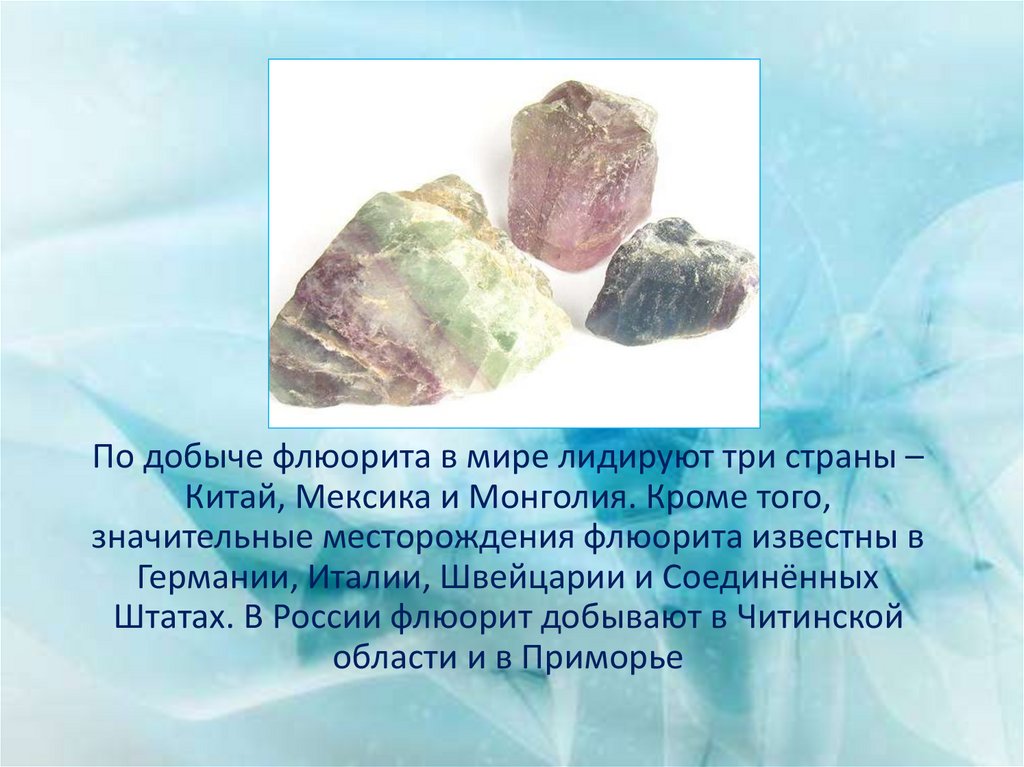По добыче флюорита в мире лидируют три страны –Китай, Мексика и Монголия. Кроме того,