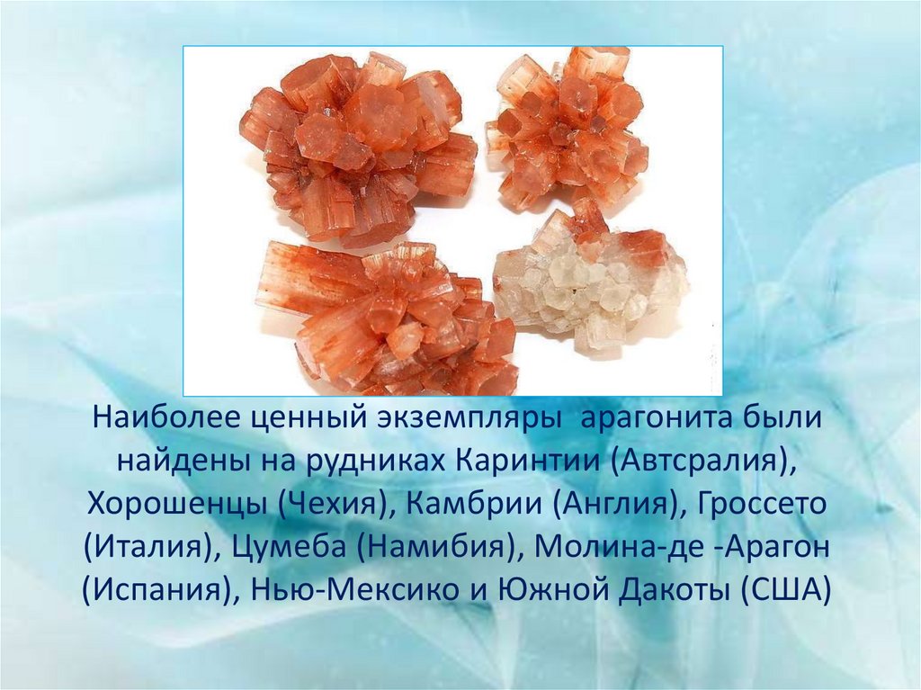 Наиболее ценный экземпляры арагонита былинайдены на рудниках Каринтии (Автсралия),