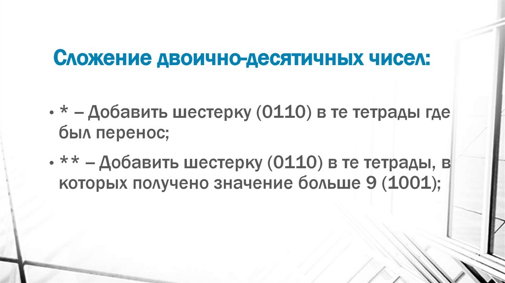 Сложение двоично-десятичных чисел:• * -- Добавить шестерку (0110) в те тетрады где