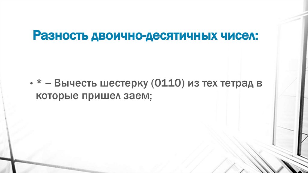 Разность двоично-десятичных чисел:• * -- Вычесть шестерку (0110) из тех тетрад в