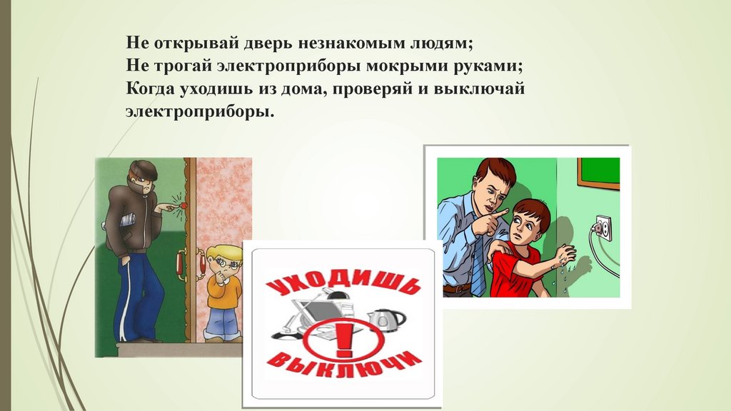 Не открывай дверь незнакомым людям;Не трогай электроприборы мокрыми руками;