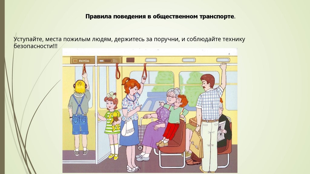 Правила поведения в общественном транспорте.Уступайте, места пожилым людям, держитесь за поручни, и соблюдайте технику
