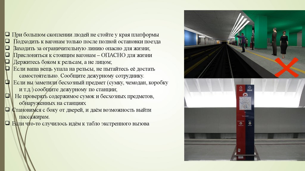 q При большом скоплении людей не стойте у края платформыq Подходить к вагонам только после полной остановки поезда