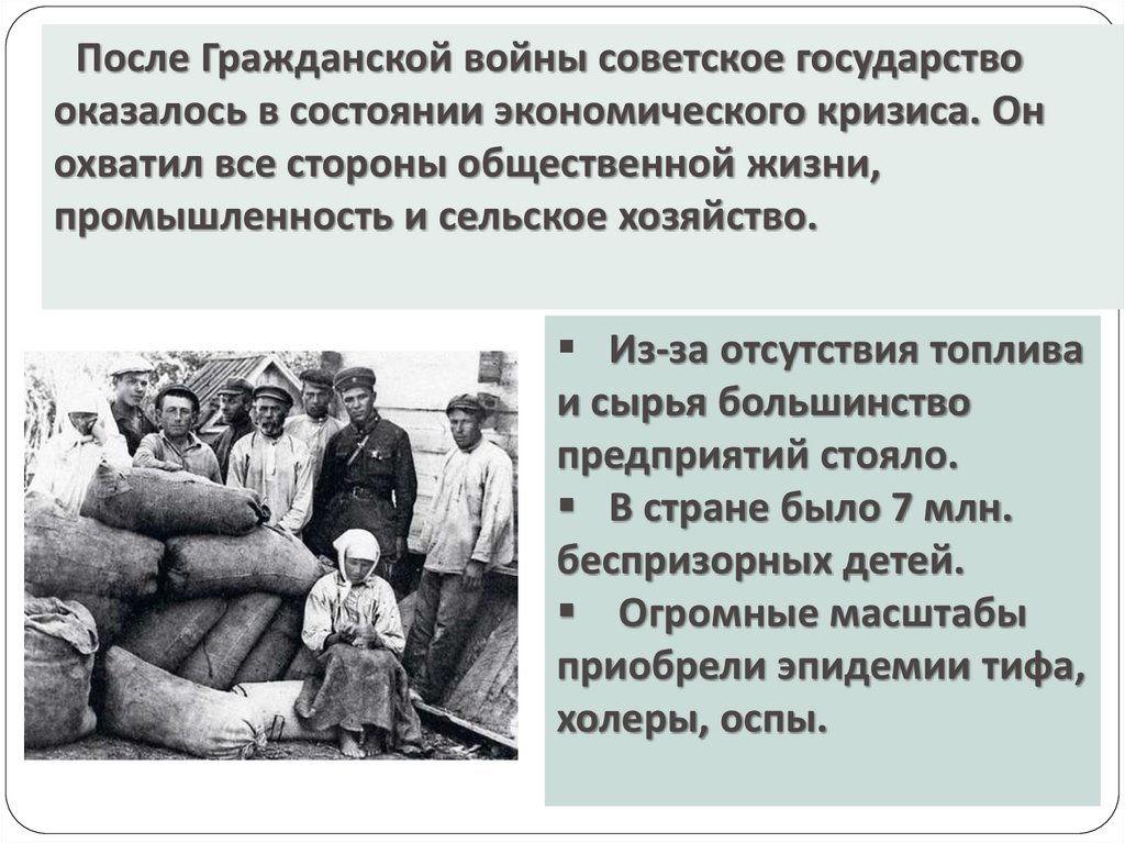 После Гражданской войны советское государствооказалось в состоянии экономического кризиса. Он