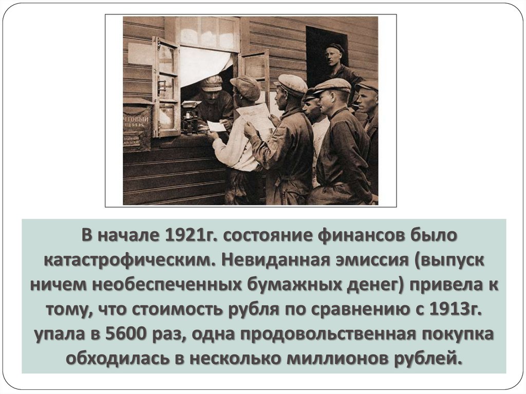 В начале 1921г. состояние финансов былокатастрофическим. Невиданная эмиссия (выпуск