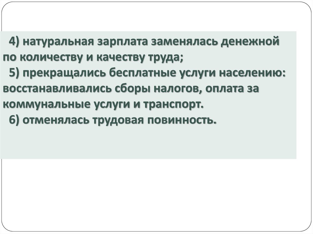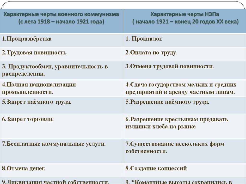 1.Продразверстка. 2.Оплата по труду. 3. Продналог. 4. Переходк товарообмену.5.Национализация промышленности. 6. Запрет
