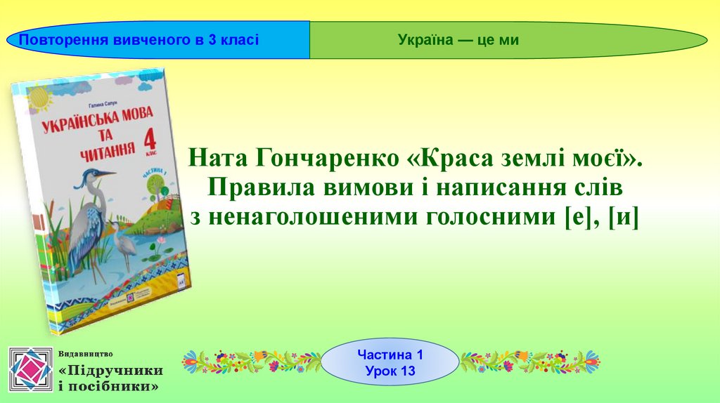 1. Ната Гончаренко «Краса землі моєї». Правила вимови і написання слів з ненаголошеними голосними [е], [и]