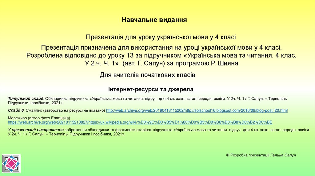 Розроблена відповідно до уроку 13 за підручником «Українська мова та читання. 4 клас.