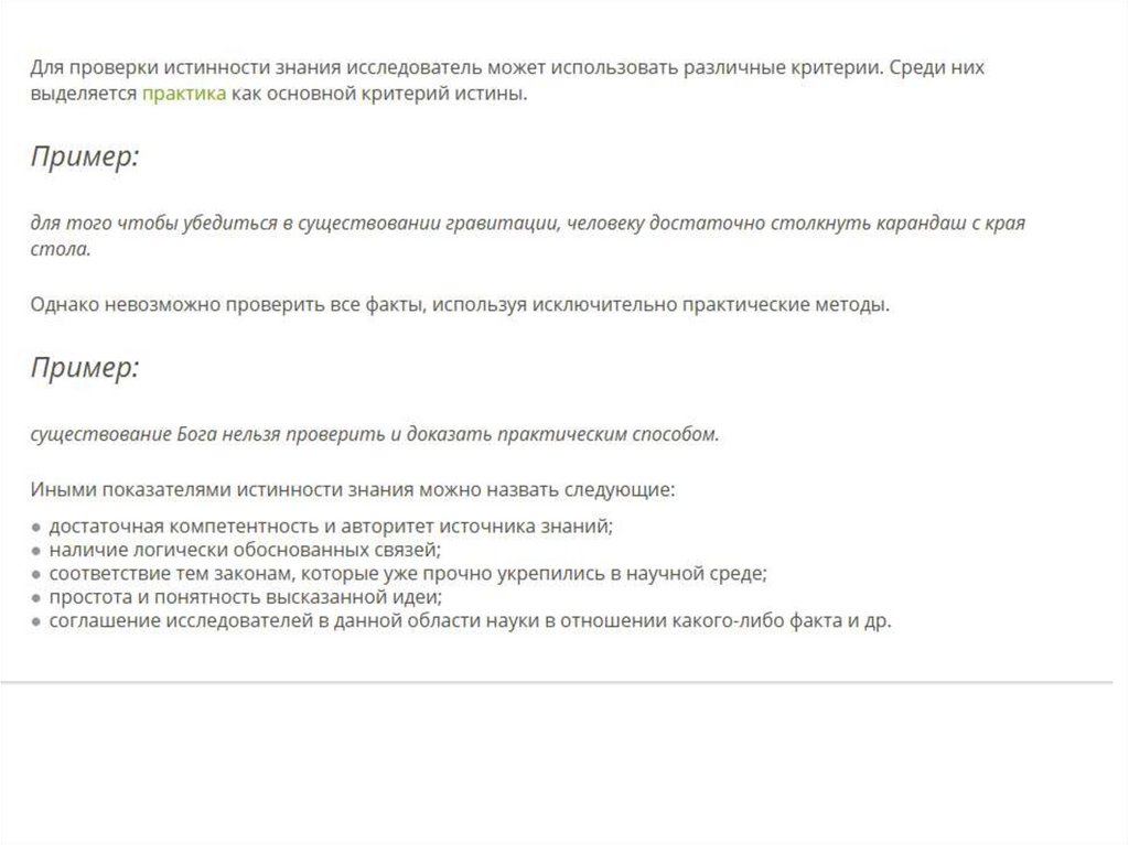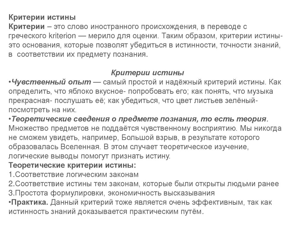греческого kriterion — мерило для оценки. Таким образом, критерии истиныэто основания, которые позволят убедиться в истинности, точности знаний,