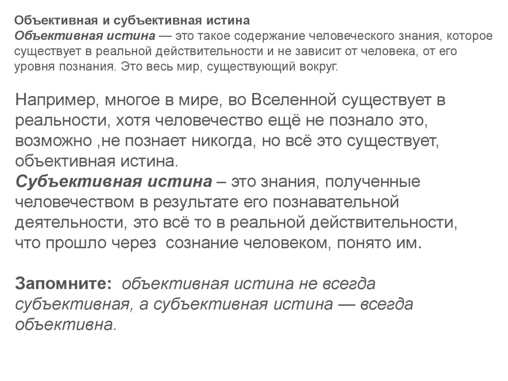Объективная и субъективная истинаОбъективная истина — это такое содержание человеческого знания, которое