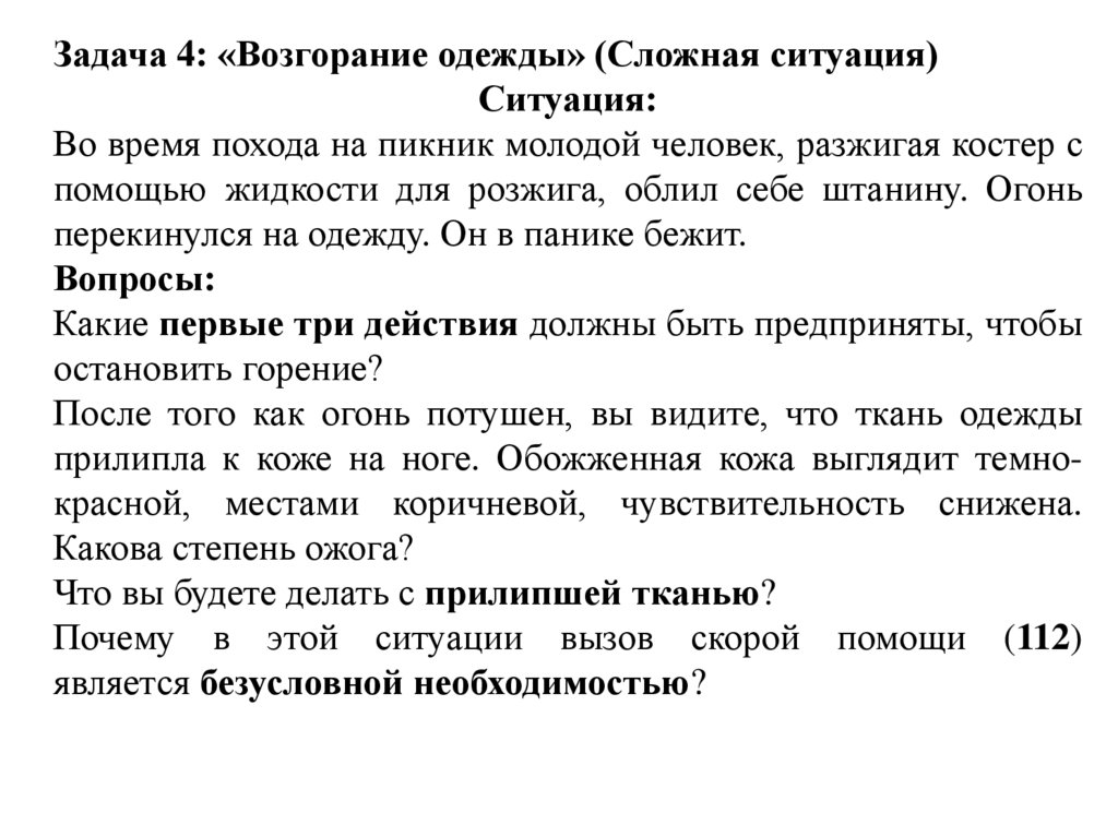 Задача 4: «Возгорание одежды» (Сложная ситуация)Ситуация: